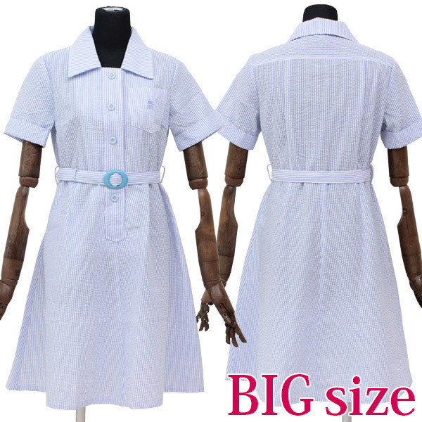 仕様:BIGサイズ:B〜102cm・W〜92cm 着丈99cm 袖丈24cm 肩幅43cm セット内容:ワンピース(前ボタン・スカートポケットあり)、ベルト(長さ調節可・、スナップボタン付き) 素材:ポリエステル65%、コットン35%