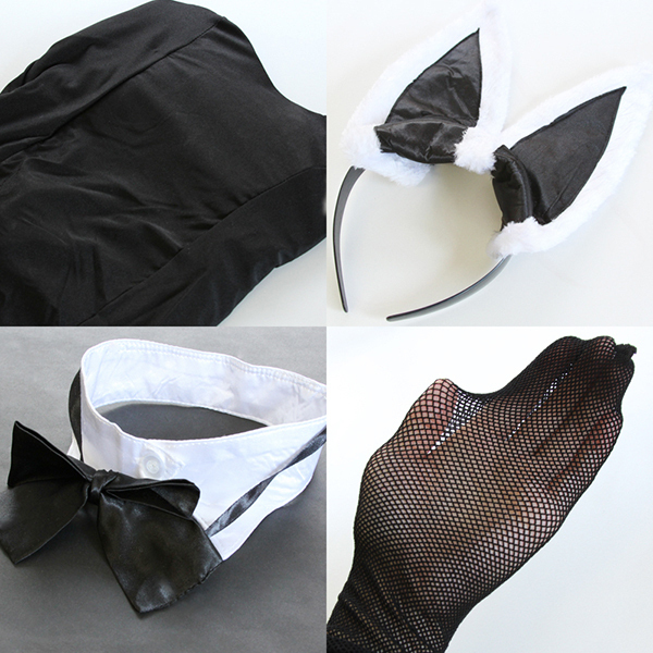 仕様:Mサイズ:B82〜90cm・W58〜65cm・H78〜90cm セット内容:レオタード・蝶ネクタイ付き襟・網タイツ・カフス・カチューシャ