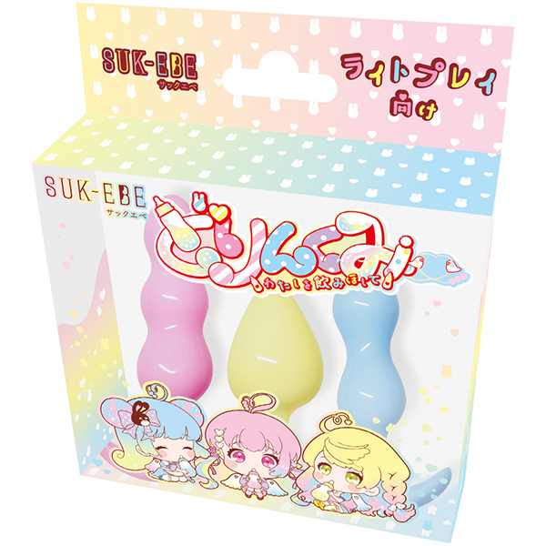 仕様:パッケージ:15.7×13.0×3.8cm 本体:ブルー(9.0×2.5cm)・イエロー(7.0×3.5cm)・ピンク(11.0×3.0cm)