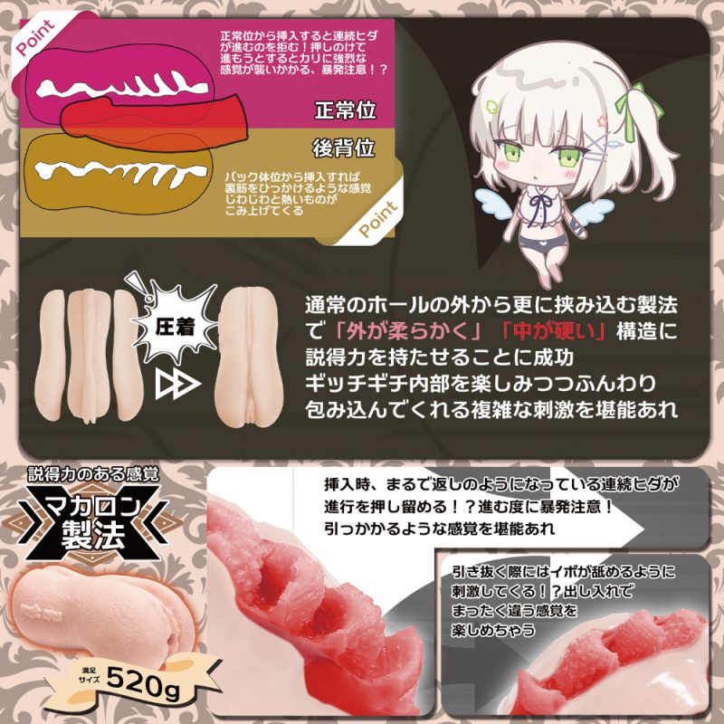 柔らかい素材を物理的に圧着して成形した非貫通オナホ「ソフトカバーなギッチギチ生膣マカロン」。内側と外側が別パーツで成形された「マカロン製法」なので充実した使用感が味わえます♪中はしっかりで外はフワフワのソフトカバータイプ!内部には粘膜層もあり3種の素材で構成されています。大きな三連返しヒダと細かなイボは上下を逆転させる事で全く異なる使用感が楽しめる!520gの大型ボディの素材には厚生労働省、食品衛生法第370号に準拠した「Magiceyes Skin」を採用しているので安心してご使用頂けます。ローション付属