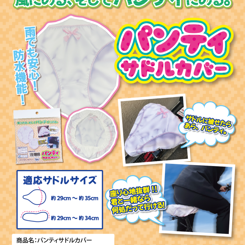 思わずドキッ!大人気パンティシリーズからサドルカバーが登場♪フルバックパンティを自転車のサドルカバーにしちゃったジョークグッズです!座り心地も抜群で、防水機能付き。パンティに座って颯爽と走る姿はとっても軽快かも!